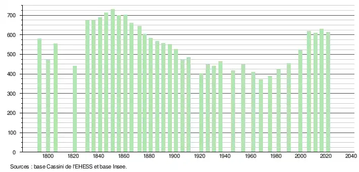 L'évolution du nombre d'habitants est connue à travers les recensements de la population effectués dans la commune depuis 1793. Pour les communes de moins de 10 000 habitants, une enquête de recensement portant sur toute la population est réalisée tous les cinq ans, les populations légales des années intermédiaires étant quant à elles estimées par interpolation ou extrapolation[21]. Pour la commune, le premier recensement exhaustif entrant dans le cadre du nouveau dispositif a été réalisé en 2006[22].