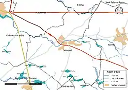 Neuf zones humides[Note 2] ont été répertoriées sur la commune par la direction départementale des territoires (DDT) et le conseil départemental d'Indre-et-Loire : « la vallée de la Fare de Sonzay à Souvigné », « la vallée de l'Ardillière de la Baronnière à la Thibaudière », « la vallée de la Fare de Souvigné à Château-la-Vallière », « l'étang des Trois Frères et suivants », « l'étang des Grêles », « les étangs de Braineau », « l'étang d'Houdran », « l'étang des Bourdinières » et « l'étang du Ripray »[8],[9].