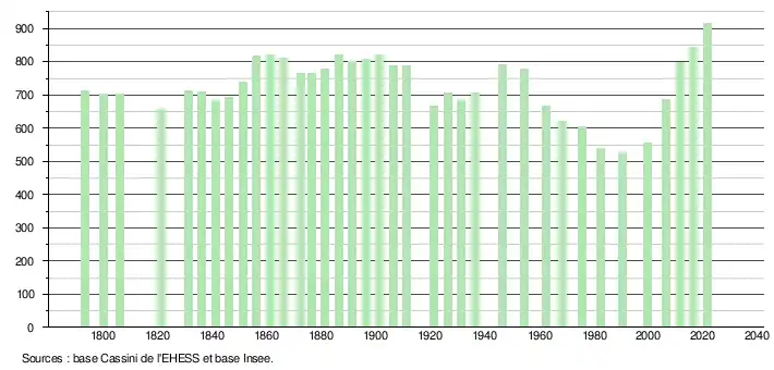 L'évolution du nombre d'habitants est connue à travers les recensements de la population effectués dans la commune depuis 1793. Pour les communes de moins de 10 000 habitants, une enquête de recensement portant sur toute la population est réalisée tous les cinq ans, les populations légales des années intermédiaires étant quant à elles estimées par interpolation ou extrapolation[26]. Pour la commune, le premier recensement exhaustif entrant dans le cadre du nouveau dispositif a été réalisé en 2006[27].