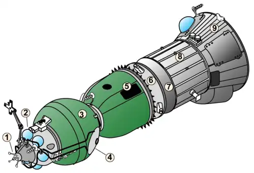- un compartiment de transition avec le module de service (Perekhodnoy Otsek), en forme de cône tronqué non pressurisé, contenant 4 paires de propulseurs utilisés pour réaliser des manœuvres de translation ;