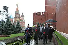Les membres d'équipage du Soyouz TMA-10M conduit à leur tour de cérémonie de la Place Rouge, le .