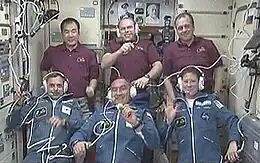 Le chiffre entre parenthèses indique le nombre de vols spatiaux effectués par l'astronaute, Soyouz TMA-18 inclus.
