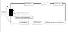 Le spectromètre utilisé en spectroscopie à cavité optique (CRDS) contient plusieurs composantes. D’une part, il y a le laser à diode, qui sert à émettre un faisceau lumineux. Juste devant le laser à diode se trouve un isolateur. L’isolateur est un petit instrument qui empêche le retour du faisceau lumineux vers la diode laser[6]. Après avoir été émis par la diode au laser, le faisceau lumineux est reflété par un miroir jusqu’à ce que le faisceau se rend dans la cellule d’absorption (cavité optique). La cellule d’absorption est l’endroit où la décroissance de l’intensité lumineuse est mesurée. C’est une petite cellule, composée de miroirs ultra-réfléchissants. Cela permet à la lumière d’être très réfléchie, menant à une augmentation significative du parcours optique entre les miroirs. C’est d’ailleurs dans cette cellule que l’échantillon à analyser est introduit[6]. Une photodiode, qui sert à convertir l’énergie lumineuse en signal électrique, est utilisée afin de mesurer l’intensité lumineuse dans la cellule d’absorption[6]. À l’aide d’un ordinateur avec le programme approprié, il est possible de définir une certaine intensité lumineuse standard. Lorsque cette intensité lumineuse est atteinte dans la cellule, un modulateur va se placer sur le trajet optique du faisceau lumineux, entre la cellule d’absorption et la diode au laser, afin de bloquer le faisceau lumineux provenant de la diode laser. Pour prendre la mesure de la décroissance de l’intensité lumineuse, il ne faut plus qu’il y ait de faisceau lumineux entrant. C’est à quoi sert le modulateur. Un déclencheur, qui est couplé avec la photodiode, sert aussi à convertir le signal lumineux en signal électrique. Le déclencheur est aussi celui qui va commencer ce qu’on nomme le cycle de réduction. Le cycle de réduction est le moment où, après avoir atteint l’intensité lumineuse prédéfinie, l’entrée d’énergie lumineuse est coupé. L’énergie lumineuse emprisonnée dans la cellule d’absorption va donc perdre de l’énergie en fonction du temps et à une vitesse dépendante de la substance à analyser. C’est la diminution d’intensité lumineuse qui est mesurée dans le temps lors du cycle de réduction[6]. La figure 1 montre de manière simplifiée, la trajectoire optique du faisceau lumineux traversant les différentes composantes du système.