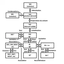 Soit M le cation métallique et X son contre-anion. Le processus d’atomisation débute lorsque l’analyte nébulisé (MX- aérosol) entre dans la flamme contenue dans l’instrument.