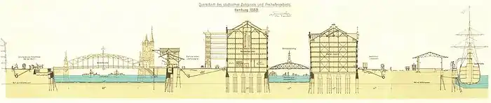 En 1883, la démolition de la zone de Kehrwieder débuta et plus de 20 000 personnes durent être relogées. Entre 1885 et 1888, la première partie fut construite et gérée par la Freihafen-Lagerhaus-Gesellschaft. Durant la Seconde Guerre mondiale, le quartier fut à moitié détruit, puis reconstruit par le célèbre architecte Garen.
