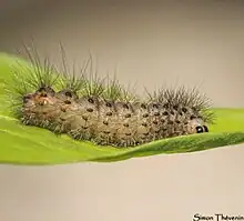 La chenille est brun foncé avec la tête noire et une ligne dorsale médiane brun clair, rouge ou orangée[2].
