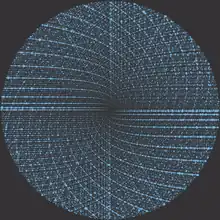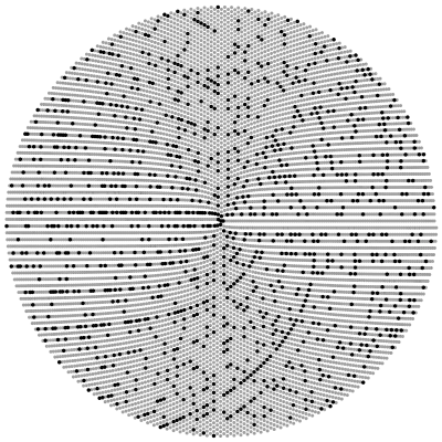 - Spirale dense en nombres premiers se terminant, dans l'illustration ci-contre, presque au bas du disque : Nombres de la forme n2 + n + 41, Il s'agit du polynôme découvert par Leonhard Euler en 1774 et qui porte son nom.