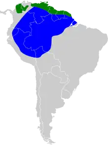 Son aire se nidification s'étend à travers les zones littorales septentrionales de l'Amérique du Sud.