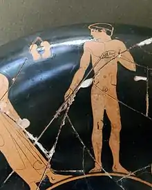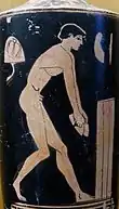 Le lancer de javelot sportif s'éloigne assez tôt du lancer militaire[56]. D'abord, l'objectif est d'obtenir le jet le plus long possible dans une direction donnée, et non d'atteindre une cible précise[50]. Le javelot lui-même est très léger[57], à peu près de l'épaisseur d'un doigt et d'une longueur variable, allant de celle du corps à une taille plus importante[58]. Très souvent, il n'a pas de pointe : il apparaît sous la forme d'un simple bâton dans les scènes de gymnase peintes, au point qu'on a longtemps cru qu'il s'agissait d'une perche pour le saut à la perche[59]. Sur certains vases, le javelot reçoit à l'une de ses extrémités une sorte de capuchon, pour éviter les accidents et pour lui permettre de se ficher plus facilement dans le sol[60]. Les javelots sans pointe sont probablement des versions d'entraînement[61].