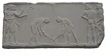 La lutte (πάλη / pálê), est un sport très populaire, peut-être davantage encore que la course à pied[67]. Elle donne son nom à la palestre (complexe d'installations sportives dont chaque cité est dotée)[67] et fournit le langage courant en métaphores sportives[68]. Ces mouvements sont repris par les peintres sur vase pour illustrer des thèmes mythologiques, comme les combats d'Héraclès contre Antée, Achéloos, Triton ou même le lion de Némée[68]. Son invention est attribuée à Palaestra, fille d'Hermès[69] ; ses règles sont supposées avoir été codifiées par Thésée, disciple d'Athéna[70].