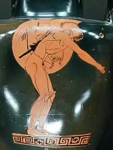 Les Grecs s'exercent entièrement nus (le terme « gymnastique » vient d'ailleurs de γυμνός, nu). Thucydide attribue l'introduction de cette pratique aux Spartiates et la présente curieusement comme un progrès par rapport à l'usage antérieur, hérité des Minoens, consistant à porter une sorte de caleçon moulant[94],[95]. De son côté, Pausanias cite Orsippos, un coureur, comme le premier athlète à avoir abandonné le pagne (περίζωμα / perízôma)[96] que l'on voit porté par des lutteurs sur certains vases archaïques[71]. Là encore, l'innovation est présentée comme un progrès : « Je crois qu'il laissa volontairement tomber sa ceinture », écrit Pausanias, « sachant bien qu'il était plus facile de courir entièrement nu, qu'avec une ceinture. » certaines représentations semblent prouver tout de même l'usage d'un suspensoir permettant plus de confort notamment pour la course.
