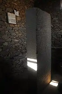 La stèle a été découverte par Henry Salt au début du XIXe siècle. Elle comporte des inscriptions[1] décrivant les victoires du roi Ezana sur les Nubiens rédigées en deux langues, le guèze (ou ge’ez) et le grec[2], mais dans trois écritures distinctes, le grec, le guèze transcrit en sudarabique et le guèze transcrit en éthiopien archaïque.