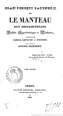 - Pirolle (fils) et J. B. François-Étienne Ajasson de Grandsagne, Crac ! Pchcht ! Baounhd ? ! ! ou le Manteau d'un sous-lieutenant : réalités hyperdrôlatiques et posthumes, écrites par Pongo, Sapajou et Houhou, sous la dictée de Auguste Jeancourt, Paris, Ajasson de Grandsagne et Pirolle fils, , 2 volumes (lire en ligne), lire en ligne sur Gallica.
