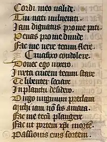 Le Stabat Mater est une hymne religieuse ainsi qu'une séquence du Moyen Âge, traditionnellement attribuée au poète franciscain Jacopone da Todi. Texte réservé à la liturgie des Heures, cette œuvre est associée à la fête de Notre-Dame des sept Douleurs par l'Église catholique dans le rite romain, d'où son nom de Sequentia de Septem Doloribus Beatæ Virginis[1]. Le Stabat Mater fut souvent mis en musique.