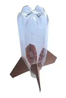 Le schéma ci-contre donne la silhouette de ce qu'on pourrait nommer une fusée type. Cette fusée est construite à partir de deux bouteilles de 1,5 L d'une boisson gazeuse[n 24]. L'une des bouteilles est conservée intègre et sert de réservoir et de moteur à la fusée. L'ogive qui vient caréner ce moteur est formée du haut de la deuxième bouteille coiffée d'un cône de papier enroulé et collé. Les quatre ailerons d'empennage sont montés sur une jupe tirée de la partie centrale (à peu près cylindrique) de la même deuxième bouteille. Ces ailerons sont carrés et leur envergure est égale au diamètre de la fusée.