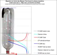 L’image ci-contre montre l’évolution du Centre des Masses d’une fusée à eau ‘’type’’ de 2 L de volume[n 30]. La courbe rouge représente l’évolution de la hauteur du Centre des Masses de la fusée complète en fonction du temps : on note que ce Centre des Masses passe par un point bas qui peut être générateur d’instabilité transitoire (selon la position du Centre des Masses à sec, donc du lestage éventuel de l’ogive, et la position du CPA total de la fusée -symbolisée par l'horizontale tiretée verte-). Sur ce graphe, les courbes tiretées rouge, bleu dense et bleu clair représentent des hauteurs calculées pour une fusée à eau immobile (au banc d'essais) puisque alors la hauteur de l'eau dans la fusée ne subit pas d'accélération. Les courbes de mêmes couleurs en trait plein ont, par contre, été calculées en tenant compte de la hauteur de la colonne d'eau dans la fusée accélérée.
