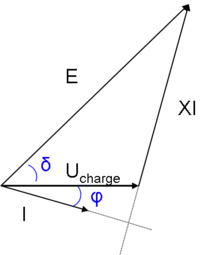 Avec les notations du schéma ci-contre, c'est-à-dire E la tension électromotrice du générateur, son impédance, I le courant, la tension à ses bornes, le déphasage entre courant et tension et l'angle interne du générateur, autrement dit l'angle entre et E.