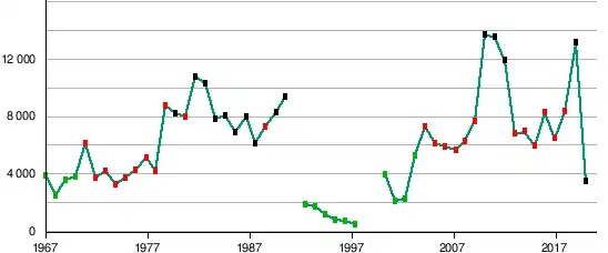 Évolution de la moyenne de spectateurs à domicile du Stade brestois depuis 1967[21]