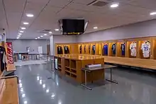 Toutes les installations, qui leur sont réservées, sont situées au niveau de la pelouse, à l’ouest, et sont directement accessibles par les bus des joueurs. Elles comprennent des locaux d’accueil et de contrôle, deux vestiaires de 120 m2 chacun (foot et rugby), un vestiaire d’athlétisme de 400 m2, deux vestiaires d’arbitres, deux chambres d’appel, deux salles d’échauffement, des bureaux pour les délégués, des locaux pour le jury, une infirmerie, des salles de contrôle antidopage. Des espaces sont également spécialement conçus pour les artistes : des loges et salons, une salle de répétition pour les musiciens, les chœurs, les figurants, une salle de stockage pour les costumes, un espace détente, des locaux pour les décors et instruments. Les vestiaires ont été pensés par Michel Platini[56].
