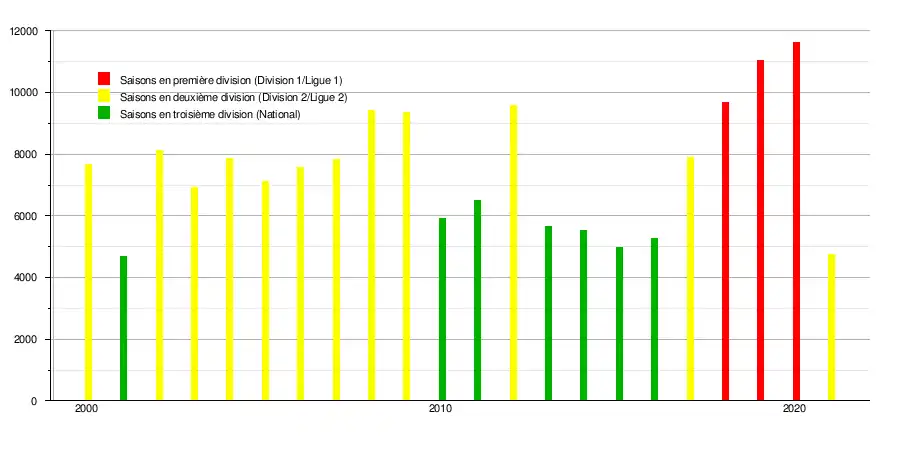 - 2019 : Agrandissement provisoire du stade permettant à la capacité du stade de passer de 12 060 places à 12 750 en attendant un possible investisseur privé.[réf. nécessaire]