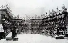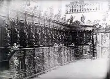 Le , les possessions du comte sont mises sous séquestre. Pour éviter une imminente liquidation judiciaire, le comte Hugo Philipp décide la vente aux enchères de tous les biens meubles appartenant à l’ancienne chartreuse. L'on disperse alors non seulement les stalles du chœur liturgique, mais aussi celles du chœur des frères, la bibliothèque, avec ses 16 800 livres, les autels, les tableaux, et les trésors d’orfèvrerie. Tous ces objets arrivent à Munich en . La vente des stalles a lieu le pour un prix de 41 100 marks, une adjudication bien au-dessous des espérances du vendeur. Le siège du célébrant reste dans l’église, seul le petit meuble attenant rapporte 700 marks. Les recherches sur l’identité de l’acquéreur des stalles, ainsi que sur leur lieu de conservation, sont restées vaines. Il est possible qu’elles soient parties en Hollande (bien que le fait ne soit attesté par aucun document), en vue d’une exposition à Amsterdam[12]. Une photographie des stalles, réalisée en 1886 à un emplacement inconnu, a été transmise en 1938 au Landesamt für Denkmalpflege par le musée de l’archevêché d’Utrecht.