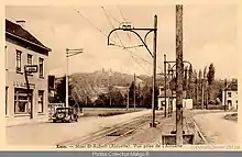 vers / Motrice sur la ligne K au terminus de la station de Kain l'Alouette avec à l'arrière-plan le mont Saint-Aubert. | |