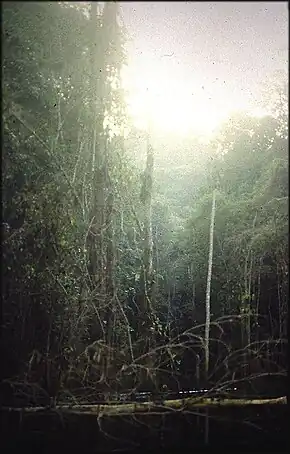 - la forêt ombrophile de terre ferme de basse altitude, parmi les plus riches du monde en biodiversité spécifique avec une canopée moyenne de 30 à 40 m de haut ponctuée d'arbres dits émergents. Hors chablis, le sous-bois y est clair et des layons permettent de s'y déplacer facilement sans trop de risque de se perdre. On y trouver notamment des palmiers du genre Astrocaryum et des lianes diversifiées et parfois très épaisses ;