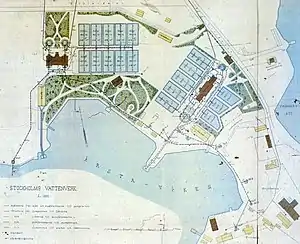 En 1853, l'ingénieur Wilhelm Leijonancker propose un réseau de distribution d'eau pour Stockholm, et en 1861, la station d'épuration de Skanstull est inaugurée sur les rives de la baie d'Årsta. L'eau est prélevée au milieu de la baie, et en cas de besoin, il est aussi possible de pomper l'eau du lac Hammarby tout proche[2]. Au même moment, et un kilomètre plus à l'ouest, on inaugure un château d'eau, puis un deuxième château d'eau est construit en 1876. Tous deux seront démolis dans les années 1930, pour laisser la place à l'hôpital Sud.