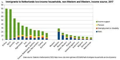 Selon Statistics Netherlands, près de 53 % des ménages de réfugiés ont un faible revenu, soit six fois plus que la moyenne néerlandaise (8,2 %)[9]. Pour les ménages syriens et érythréens, cette proportion est d'environ 80 %. Le risque de pauvreté est le plus faible parmi les ménages de réfugiés iraniens, soit 33 %. Le groupe des ménages syriens menacés de pauvreté est passé de 10 000 (76 % de tous les ménages syriens en 2016) à 18 000 (79 % de tous les ménages syriens) en 2018. Les ménages d'origine polonaise, roumaine ou bulgare présentent un risque de pauvreté supérieur à la moyenne, même si les ménages de ces pays d'Europe orientale dépendent généralement du travail pour leur revenu. Les travailleurs migrants d'Europe de l'Est occupent généralement des emplois peu qualifiés alors que les migrants d'Europe occidentale sont souvent très instruits[9].