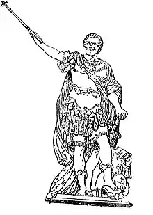 Malgré ces importantes lacunes, on peut voir que le roi, figuré en empereur conquérant, porte une cuirasse romaine et est coiffé d’une couronne de laurier.