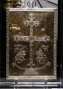 Au centre du couvercle se trouvent neuf plaques d’émaux, entourées d’une bande décorative. La rangée centrale des images est une déesis : au centre est un Christ trônant (Christ pantocrator), à gauche Jean l'Évangéliste accompagné de l'archange Gabriel, à droite Marie accompagnée de l'archange Michel. Les anges portent des habits de la cour byzantine, Marie et Jean sont vêtus de pourpre impériale. Dans les rangées au-dessus et en dessous, des saints par paires. Les registres du haut et du bas présentent les douze apôtres, groupés par deux. Les plaques centrales sont entourées d'un bandeau ornemental constellé de pierres où sont enchâssés des médaillons de huit saints en buste. Deux plaques décorées de trois rosettes figurées par des petits grenats et constellées de pierres se trouvent au-dessus et en dessous de ce cadre. Le tout est entouré de dix bandes rectangulaires[3]. Le dos du couvercle montre une croix posée sur un socle, en argent doré repoussé. Au pied de l'arbre pousse une acanthe.