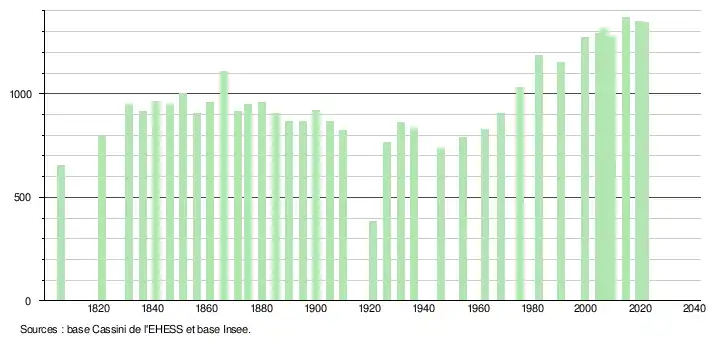 L'évolution du nombre d'habitants est connue à travers les recensements de la population effectués dans la commune depuis 1806. Pour les communes de moins de 10 000 habitants, une enquête de recensement portant sur toute la population est réalisée tous les cinq ans, les populations légales des années intermédiaires étant quant à elles estimées par interpolation ou extrapolation[26]. Pour la commune, le premier recensement exhaustif entrant dans le cadre du nouveau dispositif a été réalisé en 2004[27].