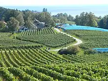 Vue du cimetière militaire allemand Meersburg-Lerchenberg, Allemagne, vers le domaine viticole Aufricht et le part de Stetten au bord du Lac de Constance