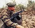 Un membre des Navy SEAL au Vietnam tient sa mitrailleuse légère Stoner 63 prête pendant que le reste de son équipe prépare des charges de démolition sur un bunker vietnamien. L'arme est équipée d'un conteneur à bande de 150 cartouches et est alimentée par le côté gauche. La poignée de rétraction est verrouillée vers l'avant et l'orifice d'éjection est fermé par un couvercle anti-poussière pour minimiser l'entrée de saletés.