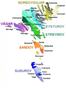 Carte des îles Féroé indiquant leur découpage en communes et région avant 2005.
