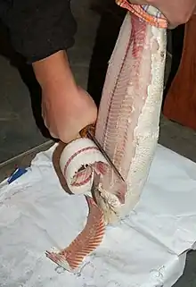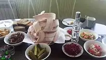 Le stroganina (en russe, строганина, littéralement « copeaux »[1]) est un plat des peuples indigènes de Sibérie arctique se composant de longues et fines tranches de poisson cru[2]. Autour du lac Baïkal, on appelle ce plat raskolotka.