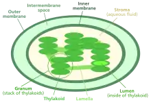Représentation simplifiée d'un chloroplaste situant le stroma, en jaune clair, entre la membrane interne du chloroplaste et la membrane des thylakoïdes.