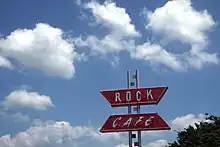 En 2001, les équipes de Pixar Animation Studios se sont rendues à la recherche des 66 Américains pour le film d’animation Cars, à une époque où l’économie de la ville tentait encore de se remettre de la tornade de 1999 et où le Rock Café était en cours de restauration. Le personnage de Radiator Springs, l'hôtelière Sally Carrera est fortement basée sur la propriétaire du Rock Café, Aube Welch et ses efforts pour promouvoir et reconstruire la ville. Un incendie a ravagé le restaurant le , le gril et les murs, en pierre d'origine ont toutefois, survécu. Le Rock Café a été reconstruit par le conservateur historique David Burke et Dawn Welch a rouvert l'établissement le .