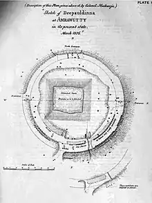C'est une visite à Amaravati du major Colin Mackenzie en 1797 qui va attirer pour la première fois l'attention des Occidentaux sur les ruines du stupa[10]. Sur la rive droite de la rivière Krishna[11] dans le district d'Andhra, dans le sud-est de l'Inde, Mackenzie tombe sur une énorme construction bouddhiste faite de briques et recouverte de dalles de calcaire[12]. Mais quand il revient sur le site en 1816, des fouilles menées sans discernement avaient déjà détruit ce qui restait de la structure, et de nombreuses briques avaient été réutilisées pour construire des maisons locales. Mackenzie effectua alors d'autres fouilles, il a enregistré ce qu'il a découvert, et dessiné un plan du stupa[13].