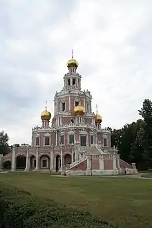 Le baroque moscovite n'est pas une simple copie du baroque allemand ou italien. Il crée en effet sous l'influence de l'architecture ukrainienne en bois un type populaire d'église à étages sans équivalent en Europe[2]. Ce style moscovite fut interrompu brutalement par l'ukase de Pierre Ier le Grand du qui fit s'arrêter les travaux en cours à Moscou pour accélérer la construction de sa nouvelle capitale à Saint-Pétersbourg. Malgré la brièveté de son apparition, ce baroque moscovite fut fécond et est à la source d'édifices de premier ordre.