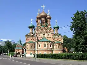 • Le monument le plus typique est l'église d'Ostankino dédiée à la Sainte-Trinité. Elle date de 1668 et fut construite sur le domaine des boyards Cheremetev. Elle est surmontée de cinq coupoles sur minces tambours au-dessus de deux rangées de kokochniki qui se chevauchent. Les portails et les encadrements de fenêtres richement décorés sont de style baroque exubérant[3].