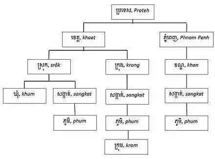 À la fin de 2013, le Cambodge comprenait 25 provinces (khmer ខេត្ត, khet[note 1]) et la capitale Phnom Penh, divisées en 185 districts, eux-mêmes répartis en 1 621 communes et 13 694 villages[1].