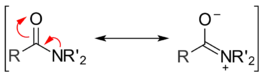 Un autre facteur qui joue un rôle dans la réactivité des composés acyle est la mésomérie. Les amides présentent deux formes mésomères, chacune contribuant à la forme réelle de la molécule, si bien que la liaison amide entre l'atome de carbone du groupe carbonyle et l'atome d'azote possède un caractère important de liaison double. La barrière énergétique à la rotation autour de la liaison amide est de 75–85 kJ/mol, bien plus grande que les valeurs observées pour les liaisons simples. Par exemple, pour la liaison simple C-C de l'éthane, la barrière énergétique est seulement de 12 kJ/mol[3]. Lorsqu'un nucléophile attaque un amide formant l'intermédiaire tétraédrique, cet effet mésomère énergétiquement favorable disparaît. Ceci aide à comprendre pourquoi les amides sont parmi les mois réactifs des dérivés acyle[4].