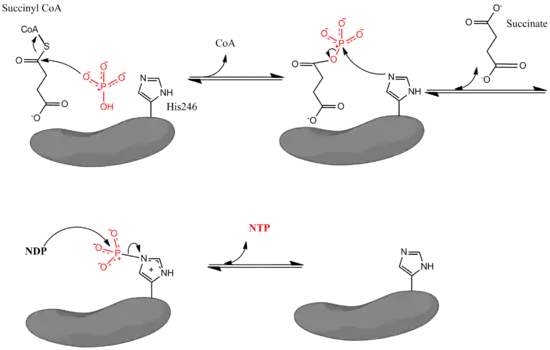 La formation du nucléoside triphosphate se produit dans un domaine de liaison à l'ATP, situé à proximité de l'extrémité N-terminale de chaque sous-unité β. Ce domaine de liaison à l'ATP est cependant distant d'environ 3,5 nm du résidu d'histidine phosphorylé[7]. Ceci laisse penser que l'enzyme subit une modification conformationnelle importante pour amener ce résidu d'histidine à proximité du site de liaison à l'ATP et permettre la formation du nucléoside triphosphate. Des expériences par mutagenèse ont établi que deux résidus de glutamate — le Glu208α à proximité de l'His246α et le Glu197β à proximité du site de liaison à l'ATP — jouent un rôle dans la phosphorylation et la déphosphorylation de l'histidine, mais le mécanisme exact de ces modifications conformationnelles n'est pas entièrement compris[9].