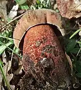 La chair est jaune, bleuissante à la coupe, de couleur rouge betterave à la base[4].