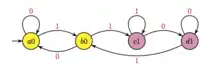 Comme la suite des pliages est automatique, elle est engendrée par un automate. On voit sur l'automate ci-contre que 01 conduit, depuis tout état, à l'état , donc que ; de même, 11 conduit à l'état , donc .