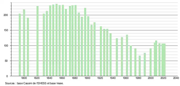 L'évolution du nombre d'habitants est connue à travers les recensements de la population effectués dans la commune depuis 1793. Pour les communes de moins de 10 000 habitants, une enquête de recensement portant sur toute la population est réalisée tous les cinq ans, les populations légales des années intermédiaires étant quant à elles estimées par interpolation ou extrapolation[26]. Pour la commune, le premier recensement exhaustif entrant dans le cadre du nouveau dispositif a été réalisé en 2008[27].