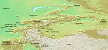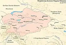 Lorsque le Chagatai ulus, qui englobait à la fois le Turkestan oriental et occidental, s'est effondré, le résultat a été la création de deux États différents : Maverannahr au Turkestan occidental, avec sa capitale à Samarkand, où Timur le Grand est arrivé au pouvoir en 1370, et le Moghulistan, avec sa capitale à Almalik, près de l'actuelle ville de Gulja, dans la vallée d'Ili. Le Moghulistan comprenait des terres sédentaires du Turkestan oriental ainsi que des terres nomades au nord de Tangri Tagh . Les terres habitées étaient connues à l'époque sous le nom de Manglai Sobe ou Mangalai Suyah, qui se traduit par Shiny Land, ou Terre avancée qui faisait face au soleil. Ces terres comprenaient des villes-oasis de l'ouest et du centre du Tarim, telles que Khotan, Yarkand, Yangihisar, Kashgar, Aksu et Uch Turpan ; et impliquait à peine les villes-oasis de l'est de Tangri Tagh, telles que Kucha, Karashahr, Turpan et Kumul, où existaient encore une administration ouïghoure locale et une population bouddhiste. Les zones nomades comprenaient l'actuel Kirghizistan et une partie du Kazakhstan, y compris Jettisu, la région des sept rivières.