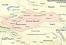 L'historien Mirza Muhammad Haidar, en 1546, a appelé la partie orientale du pays le « Khanat oriental ou Ouïghourstan » dans son célèbre livre Tarikh-i-Rashidi, écrit au Cachemire. La capitale de cet État était Yarkand, et elle était connue sous les noms de mamlakati Saidiya, mamlakati Yarkand et mamlakati Moghuliya dans les sources iraniennes. Le nom de famille n'était cependant pas exact, car à cette époque l'État nomade du Moghulistan s'était effondré. Elle fut éliminée au cours des XVe et XVIe siècles par les tribus nomades des Kirghizes, des Kazakhs et des Jungars, qui s'emparèrent de toutes les terres mogholes au nord de Tangri Tagh . Les restes des Moghols (environ 5 000 familles, pour la plupart issues des ulus des Barlas, Churas et Arlat ) se sont déplacés vers la Kashgaria et se sont mélangés à la population locale de 1 000 000 Ouïghours, bien qu'un groupe de Moghols, au nombre de 30 000 hommes, ait rejoint Babur, un descendant de Timur le Grand par son père Omar Sheikh Mirza, et descendant de Chagatai Khan par sa mère Kutluk Nigar Khanum, fille du Moghol Yunus Khan, à Kunduz, en 1512, et l'aida dans son invasion de l'Inde. L'État de Babur en Inde était connu sous le nom d'Empire Moghol, et cet État a reconnu le Khanat de Yarkand en 1529 (lorsque Babur et le sultan Said Khan ont réglé pacifiquement le problème autour du Badakhshan, qui était revendiqué par les deux cousins comme leur terre héréditaire) comme il l'a fait pour les Shaybanides. état à Maverannahr, en 1538.