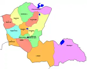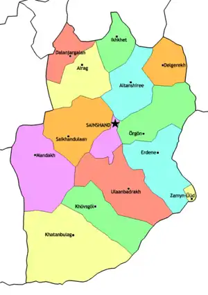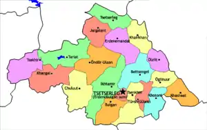 La Mongolie est divisée en 21 aïmags (provinces), eux-mêmes partagés en sums (districts). Il existe au total 315 sums.